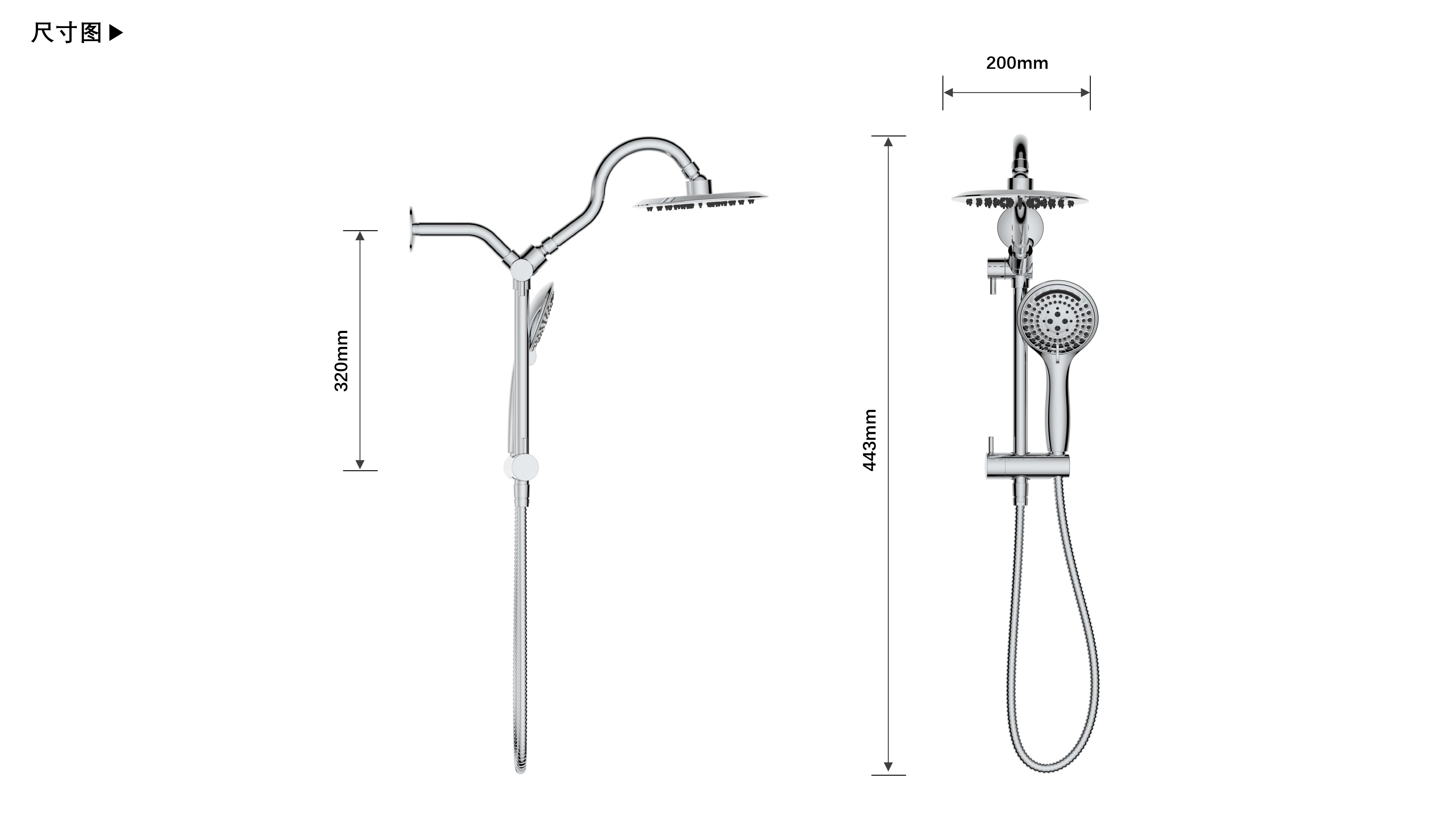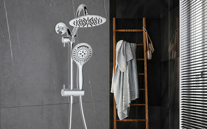 上出水彎管套裝;頂噴內置球頭,可實現(xiàn)多角度旋轉調整;把手切換頂噴出水、花灑出水;轉動把手調節(jié)滑座高低